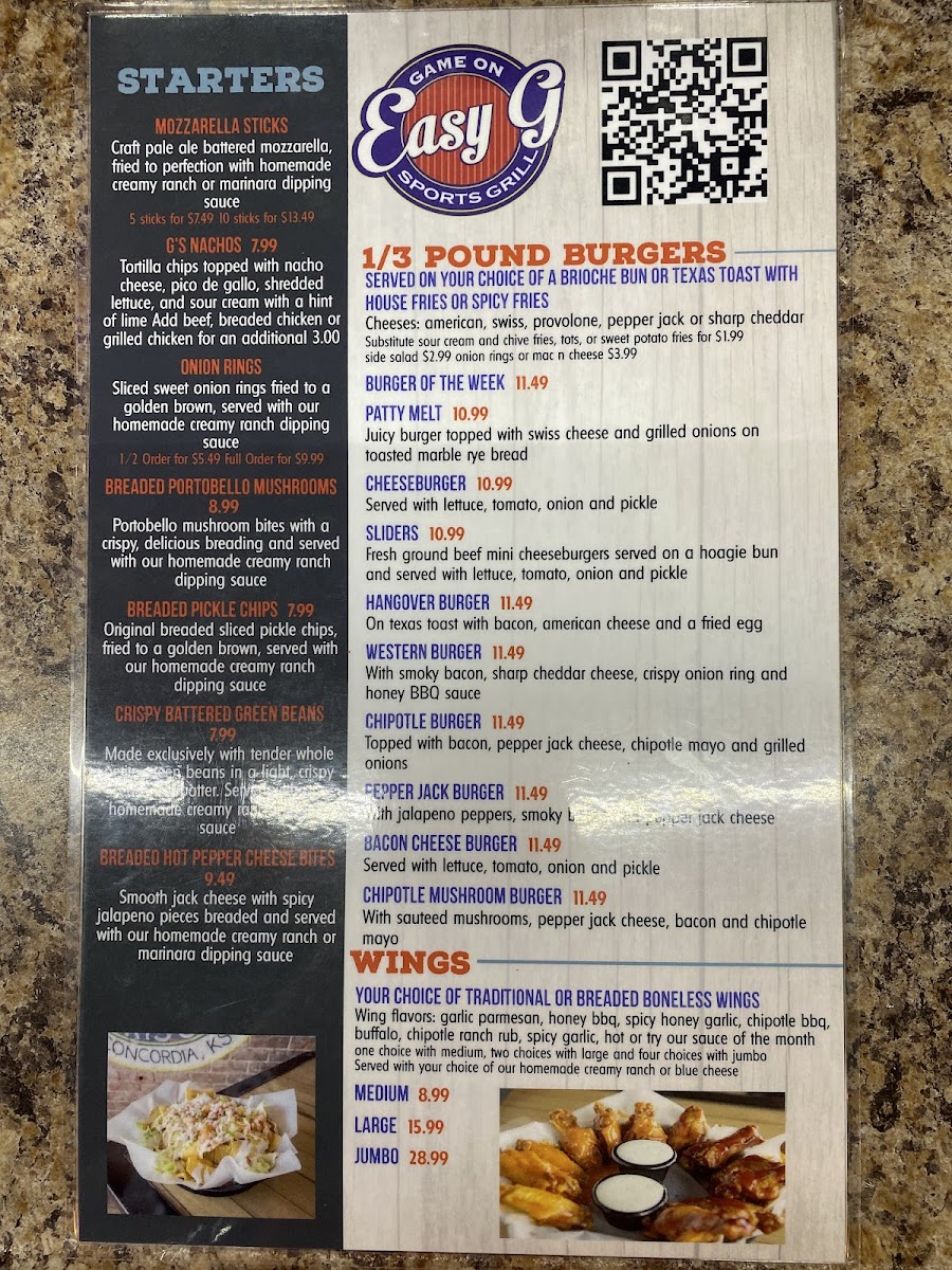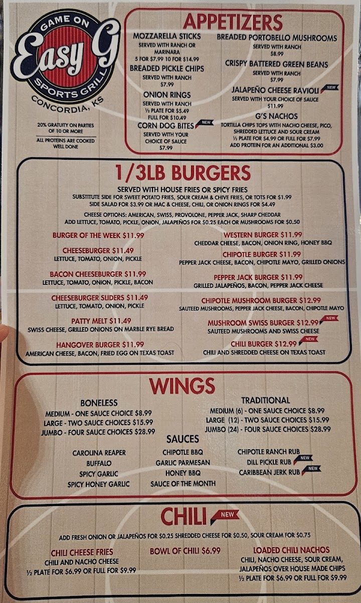 Welcome to Easy G Sports Grill, a vibrant eatery located at 107 W 6th St, Concordia, KS, where sports and delicious food collide. The menu features a tantalizing array of starters, including Crispy Battered Green Beans served with homemade ranch, and savory Mozzarella Sticks that set the stage for a fantastic meal.